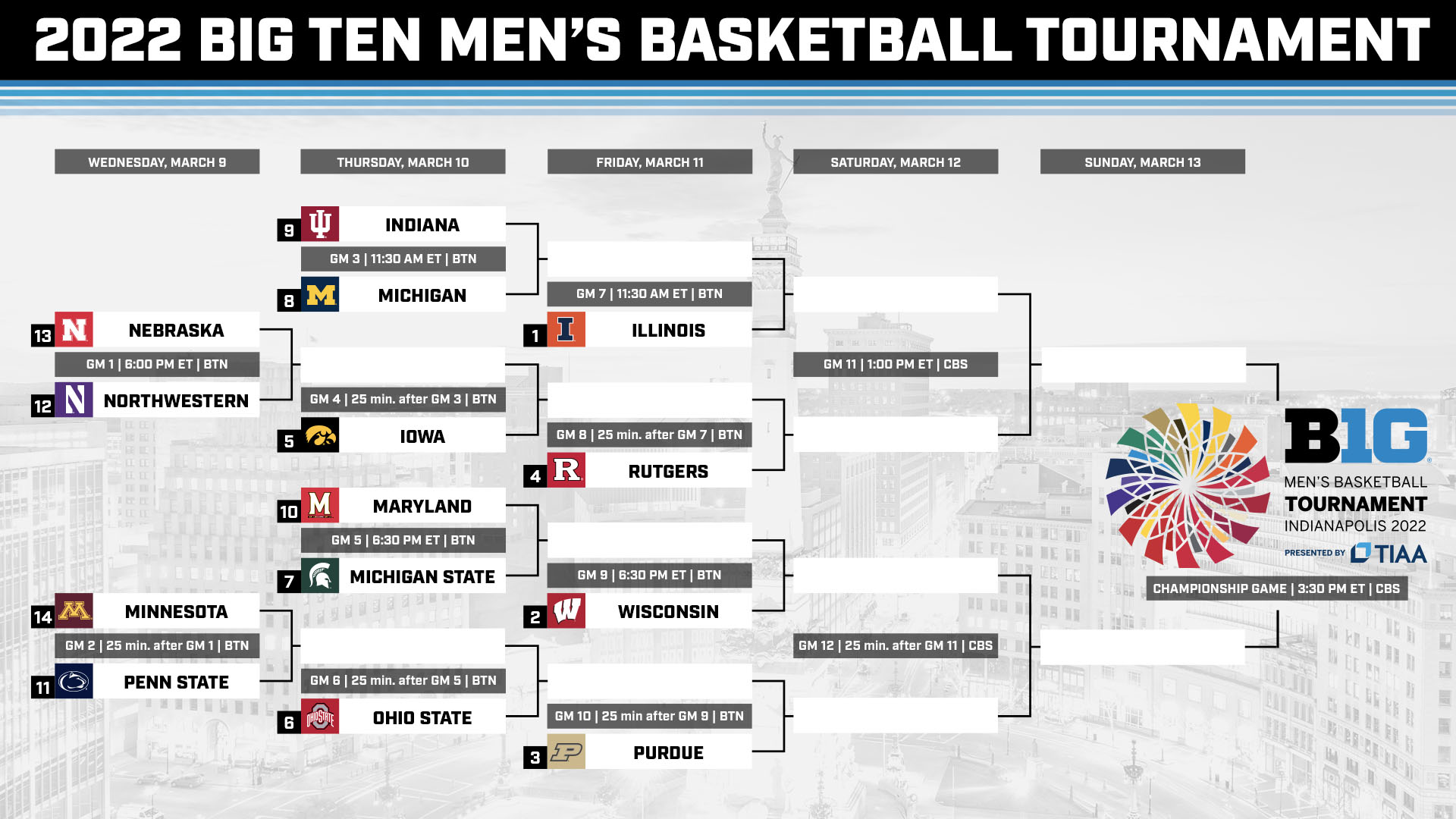 Wednesday March 10 First Round Game 1 Seed 12 vs. Tiebreaking procedures remained unchanged from the 2021 tournament. 7 seed Michigan State 630 pm BTN.